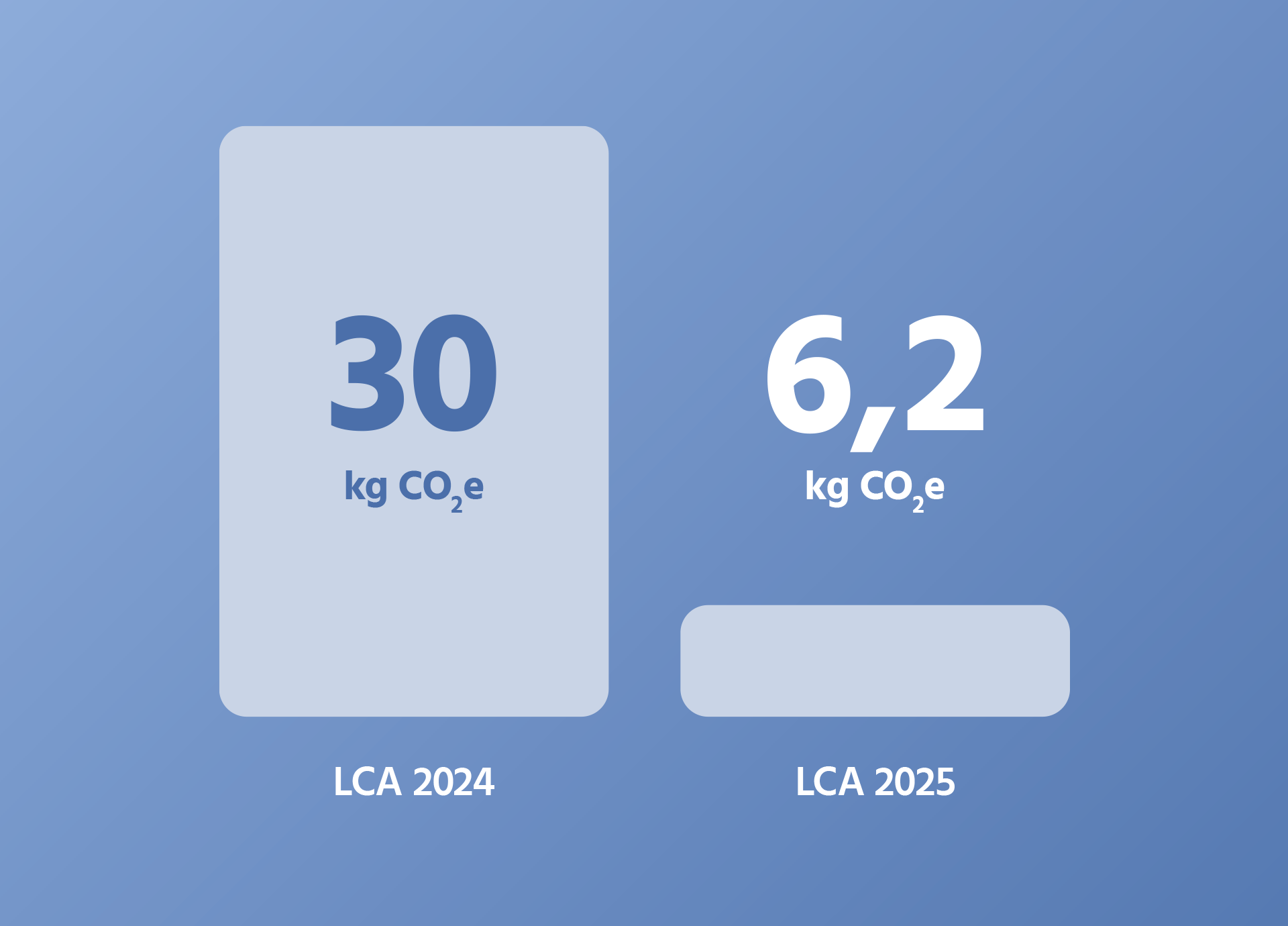 To summarize briefly: last year’s LCA showed that the product emitted around 30 kg CO2e, while today’s LCA shows that the actual value is closer to 6.2 kg CO2e. That’s quite a difference – and compared to similar products, we believe this is a strong result we can be proud of.